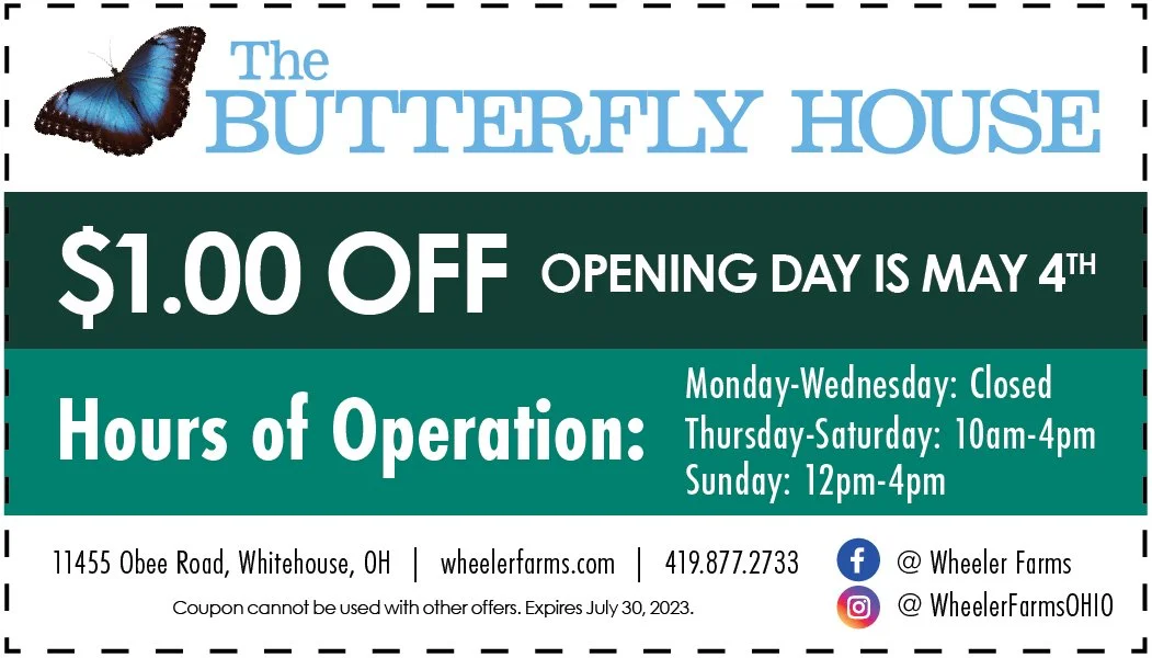 The Butterfly House is located at 11455 Obee Road in Whitehouse, Ohio. We're right next to the Corn Maze and The Stables.